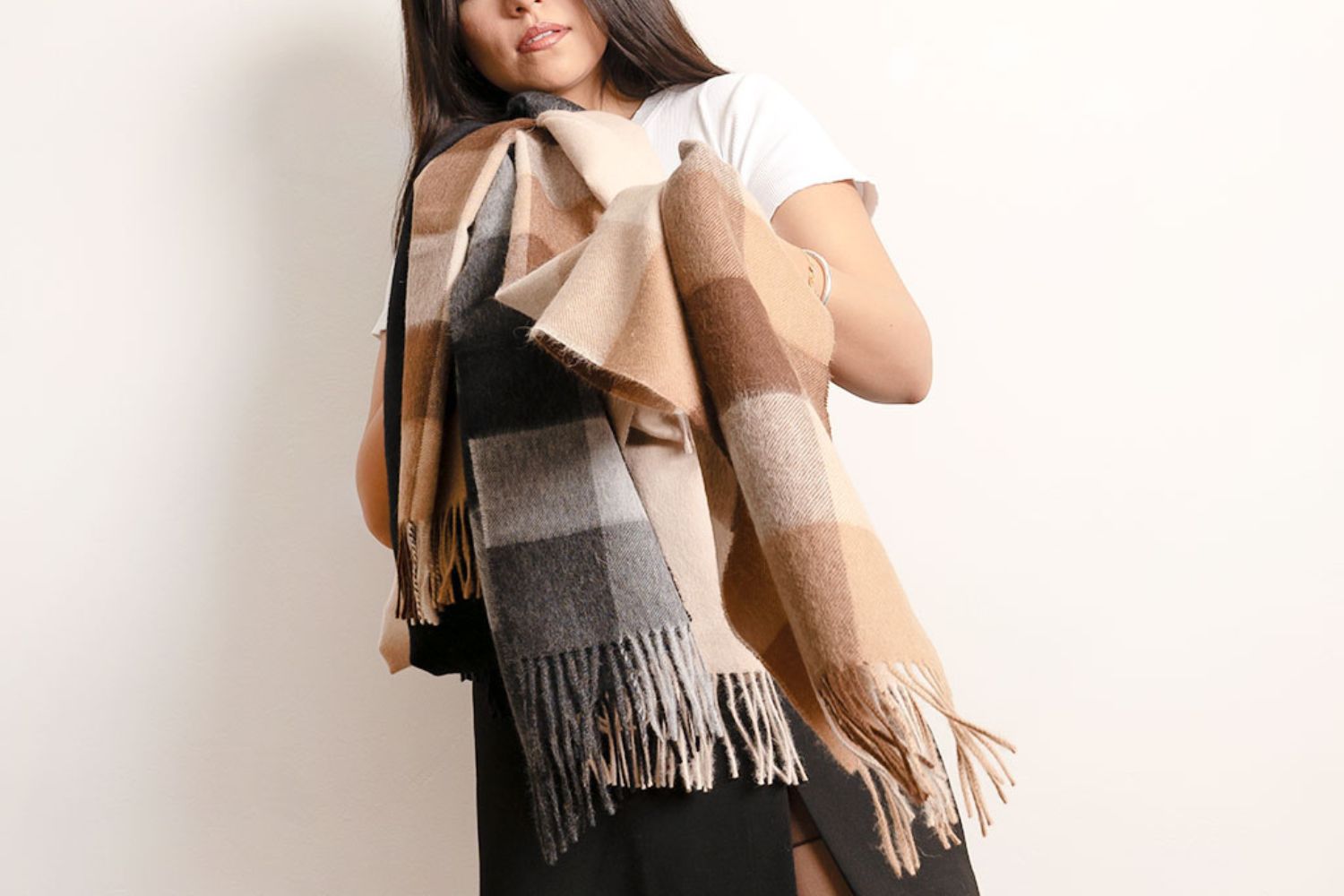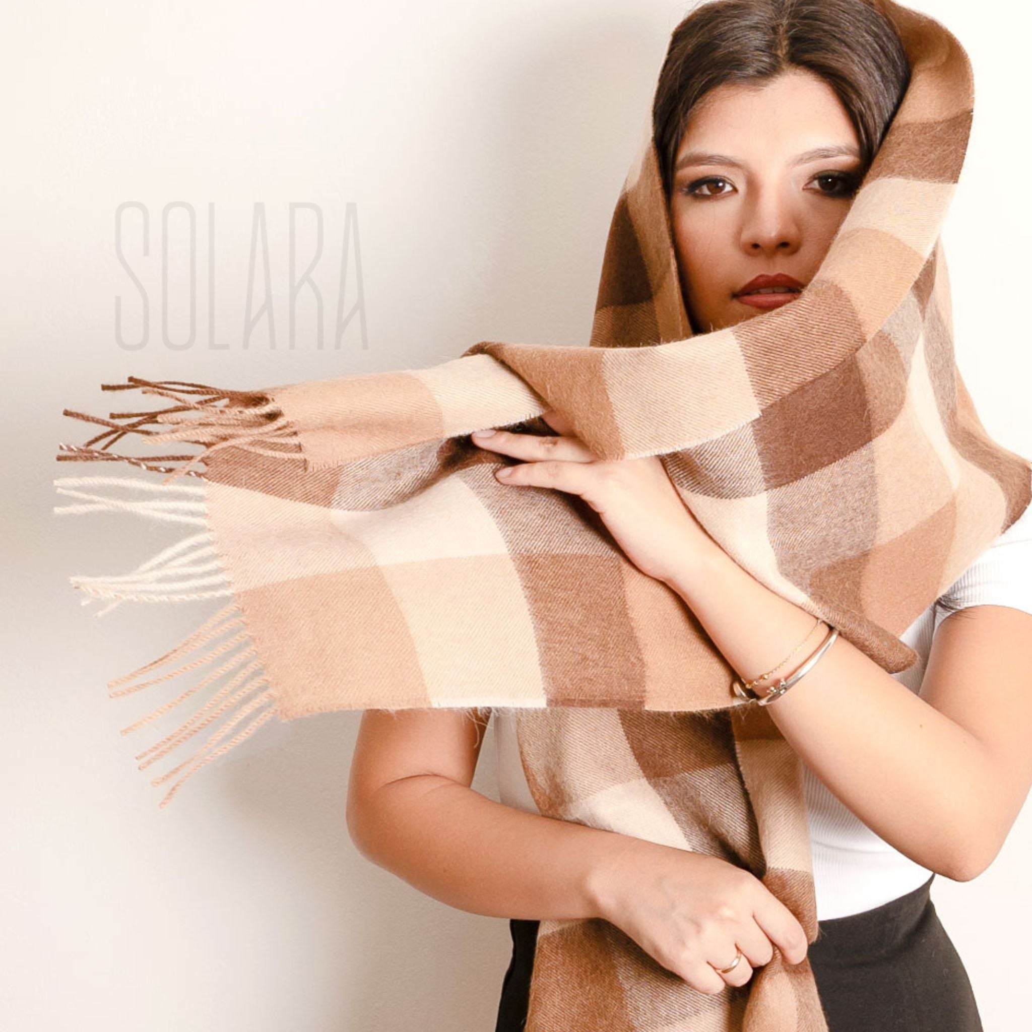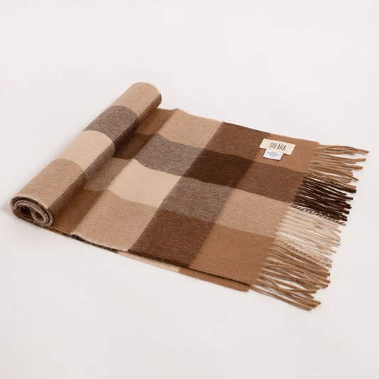 Beige & Brown Checkered Peruvian 100% Baby Alpaca Scarf
